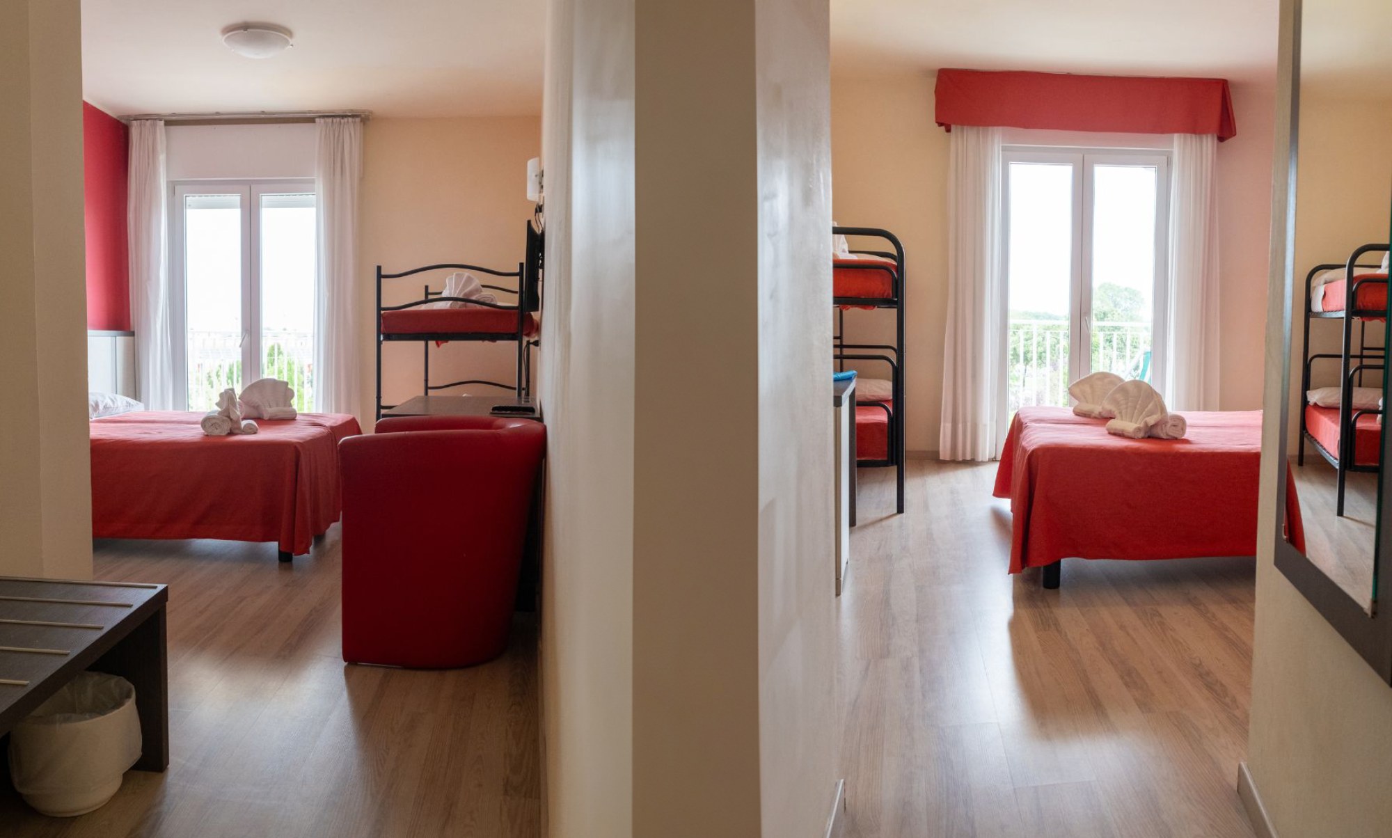 Each Family Room is decorated with an elegant red theme, is bright, and furnished with modern decor, a balcony, TV, Wi-Fi coverage, heating, and a safe.